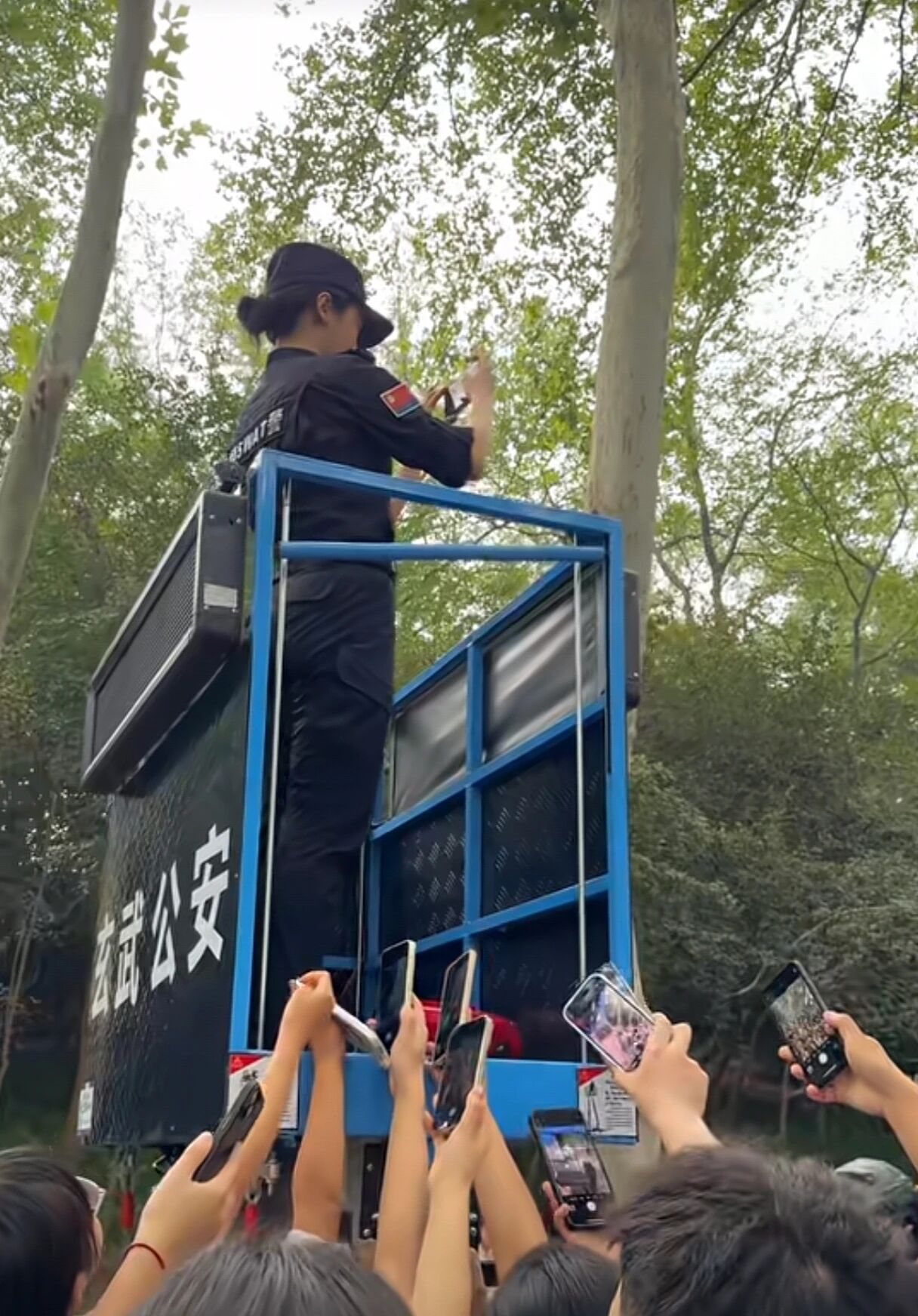 “别急别急,拿好手机。拍完你的,拍你的!”南京钟山梧桐大道几乎是每一个来宁游客必打卡之地。民警在可升降执勤台上工作时也占据了“最佳拍照位”,于是,随着游客一只只手机递来,女民警化身“最高拍照主理人”,给游客们拍下一张张绝佳出片照。