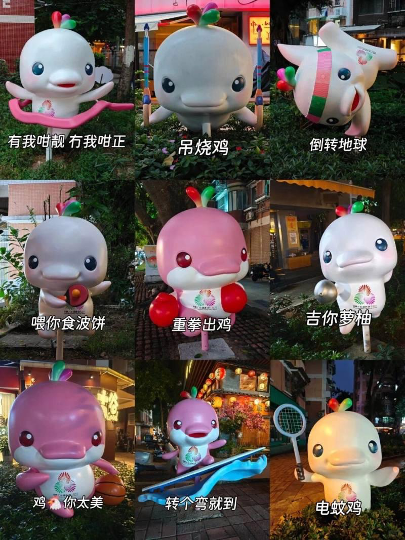 “大湾鸡”,本名“喜洋洋”和“乐融融”,原型为国家一级保护动物中华白海豚,头顶是由广东木棉红、香港紫荆紫、澳门莲花绿组成的三色小水花,象征粤港澳三地紧密相连。网友:有鸡冠、有鸡翼,我不管,它就是鸡。于是,一场“指豚为鸡”的网络乌龙就这么传开了……“大湾区”粤语发音顺势改为“大湾鸡”,加之当地人对白切鸡和豉油鸡的喜爱,一切都显得刚刚好。